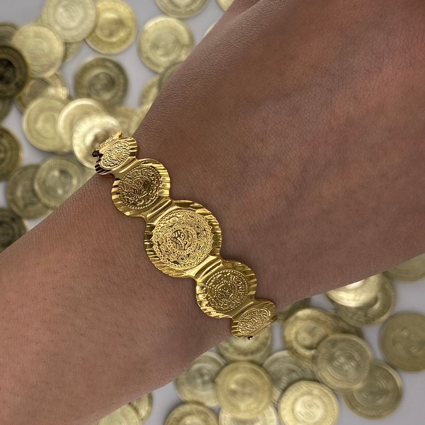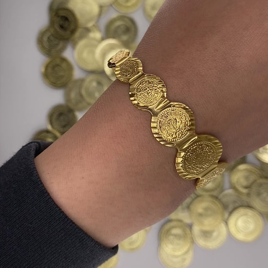 Presenting the Khadijah Coin Cuff Bangle, a luminous 24k Gold Plated Brass masterpiece that seamlessly marries elegance with an open cuff design, ensuring a versatile fit for various sizes. Named after a woman with a gift for captivating storytelling, an artist, and a profound thinker, this bracelet embodies not just style but the essence of a creative soul. Perfect for galas and soirées, this radiant cuff bangle adds a touch of opulence and sophistication to any ensemble. To maintain the allure, avoid exposure to water and harsh chemicals, and store them in a cool, dry place when not wearing them.