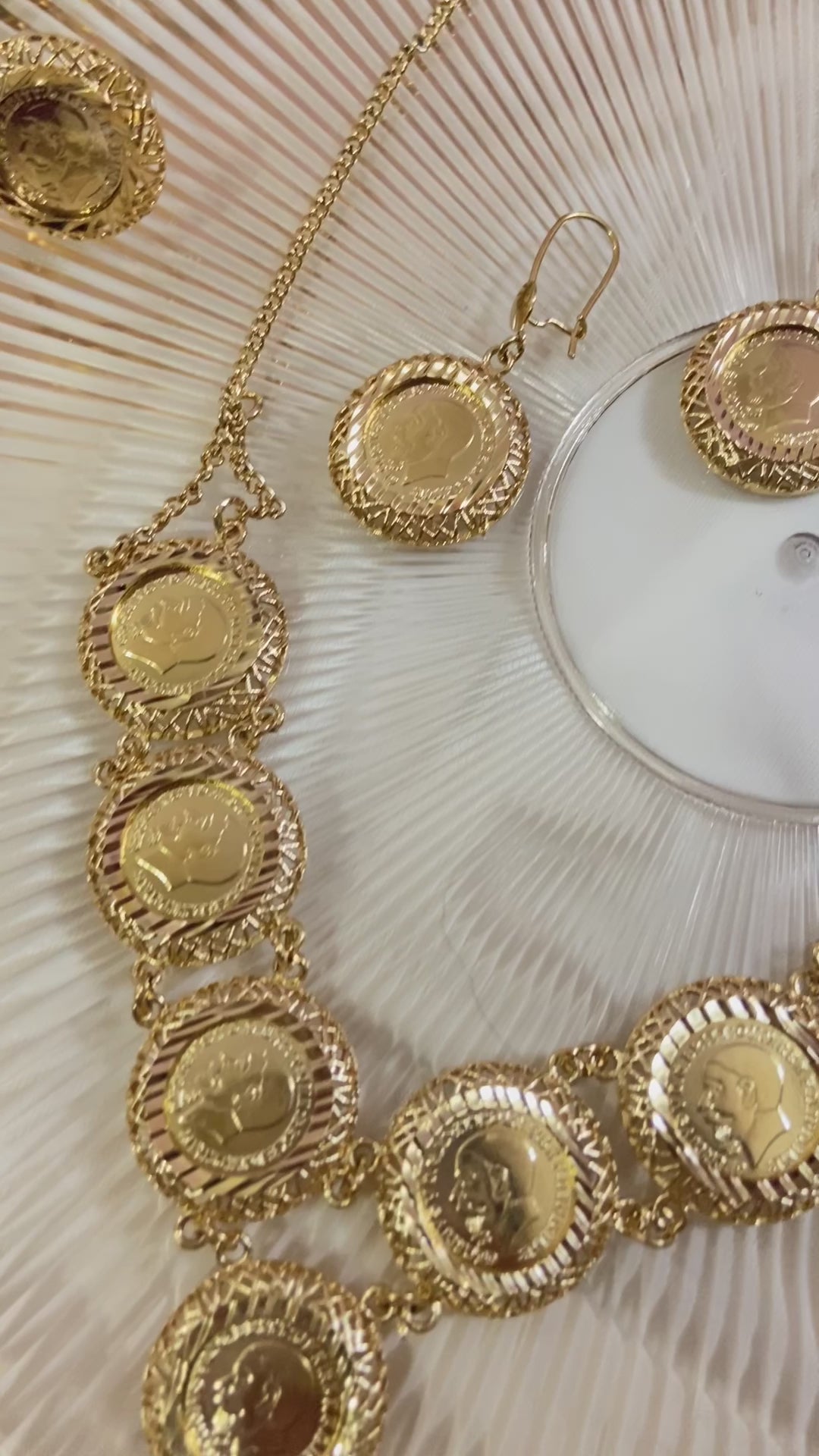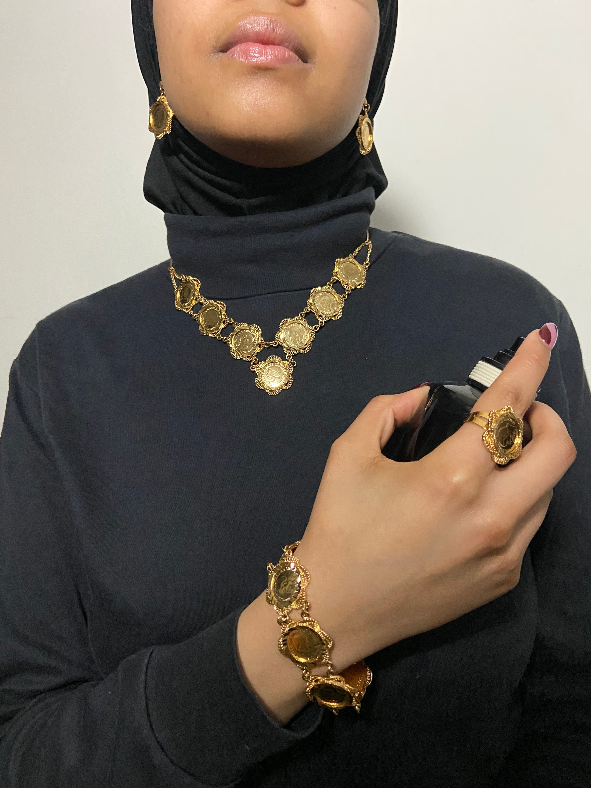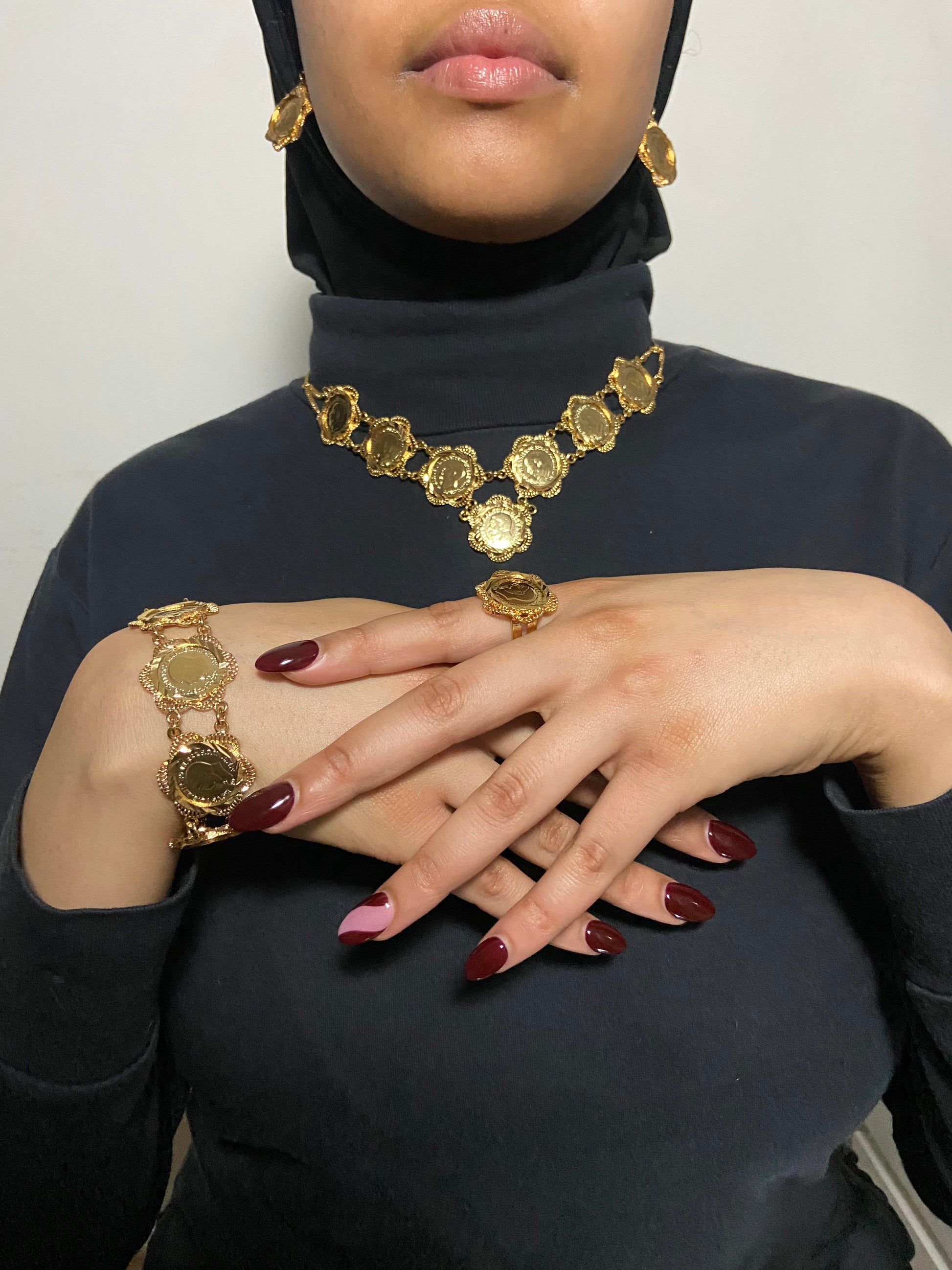 Introducing the Maha Classic Coin Set – a homage to my mother's passion for traditional coin jewelry. Named after her, this set includes a necklace, ring, bracelet, and earrings, each plated in luxurious 24K gold. My mother not only adorns herself with these pieces on every occasion but has also guided me in the art of accessorizing, sharing cultural insights on when and how to wear each piece. Embrace the timeless elegance of the Maha Classic Coin Set, perfect for any party or special occasion. To maintain their luxurious shine, store these pieces in a dry place away from moisture and chemicals
