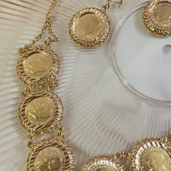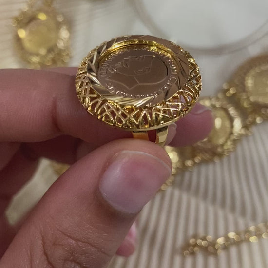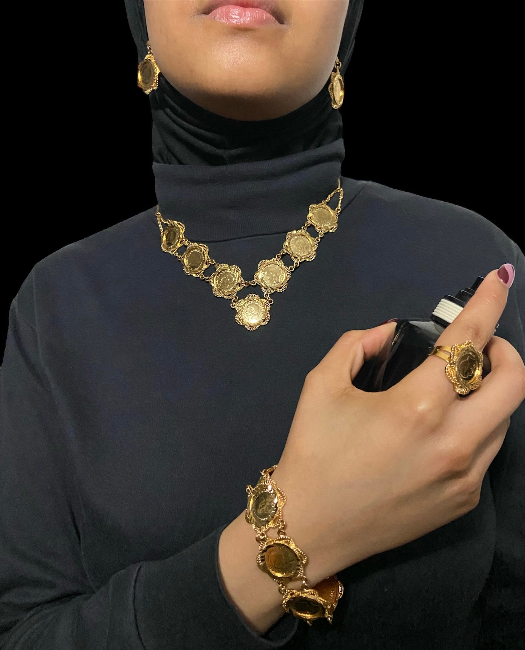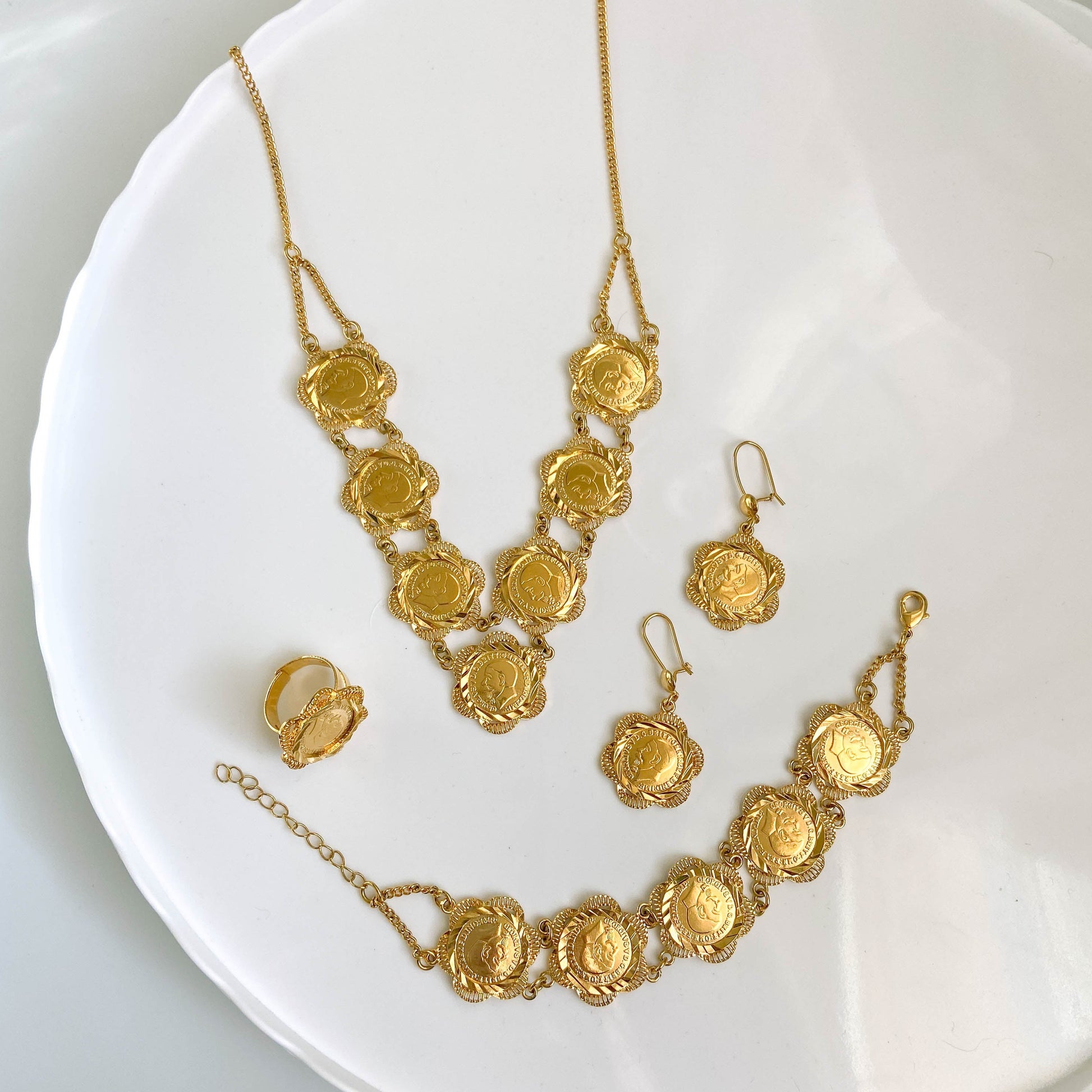 Introducing the Maha Classic Coin Set – a homage to my mother's passion for traditional coin jewelry. Named after her, this set includes a necklace, ring, bracelet, and earrings, each plated in luxurious 24K gold. My mother not only adorns herself with these pieces on every occasion but has also guided me in the art of accessorizing, sharing cultural insights on when and how to wear each piece. Embrace the timeless elegance of the Maha Classic Coin Set, perfect for any party or special occasion. To maintain their luxurious shine, store these pieces in a dry place away from moisture and chemicals