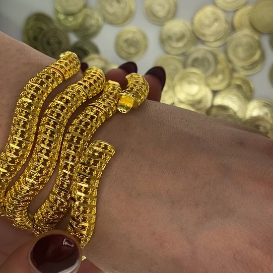Introducing the Samira Bangle Set – a bold tribute to the timeless wisdom and enduring spirit of my paternal grandmother, Samira. This collection of four bangles exudes the opulence of 24K gold, adding a touch of maximalist elegance to any ensemble. Designed for effortless wear, each bangle features a seamless snap hinge closure for easy opening and closing, ensuring comfort and style. Embrace the rich stories and wisdom embodied in the Samira Bangle Set, where tradition meets bold sophistication in every gleaming detail. To maintain their luxurious shine, store in a dry place away from moisture and chemicals. This is a Final Few bundle and not eligible for returns or exchanges. ONLY 2 pieces are for sale. It is NOT a bundle of 4. Samira Bangles will not be restocked.
